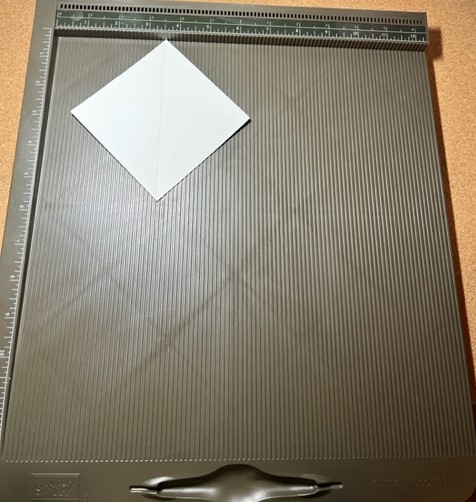 I started with a 4 x 4″ piece of white cardstock. Lay it on your scoring board on a diagonal and score at equal intervals. I used 1/2″ intervals but you could definitively make them bigger or smaller.