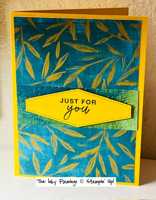This piece of DSP is attached to a Crushed Curry cardstock base, and I like how it highlights the leaves in the DSP. I used a small scrap of DSP from this same collection and embossed it , to add a little bit of texture underneath the greeting, which is popped up on dimensionals.