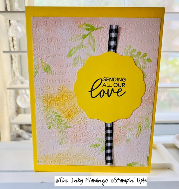 Card #3: Daffodil Delight cardstock, Rings of Love DSP (retired), black and white gingham ribbon 1/4″ (retired), Decorative Circle Punch 2 3/8″ (retired), Timeworn Type 3D embossing folder(retired), Paper Pumpkin stamp, Tuxedo Black Memento ink pad
