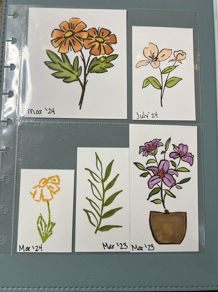 If I stamped them and didn’t like the result, I didn’t include them here. For instance, last March (2024) the set also include a couple of flower heads, leaves and an awkward looking stem. I just didn’t like how the image looked when I stamped it and knew I would never use it.