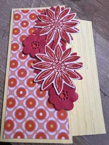 7. Make and assemble your die cuts. For my main flowers, I used a die cut out of colored cardstock, a stamped image, and attached them using dimensionals. The smaller flower was cut out of colored cardstock, and all were attached to the front of the card.