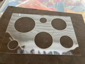 5. Make your stencil: Use a piece of acetate or cardstock, and with circle dies or punches, create several holes of different sizes, leaving room between the circles. You know the plastic backing that new stamps are mounted on? That’s what I used.
