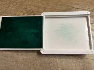 3. Dip your blending brush into your lightest ink, then dab it onto a scrap piece of paper to remove excess ink. This should be done every time you dip your brush directly onto the inkpad. You can also dab it onto a glass mat if you have one, or simply onto the inside of the stamp case, as shown below. The nice thing about using a glass mat or the inside of the stamp case is that if you need a little more ink, you can dip your brush into it again, minimizing waste. If you dab off on a porous material, such as paper, it will absorb all the ink.