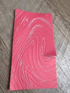 I embossed the two tone cardstock, and you’ll see some faint parts of the white core showing through. If you look close enough on the right side, you may notice a small tear in the paper. Note to self: Remember to lightly mist the two tone cardstock prior to embossing!