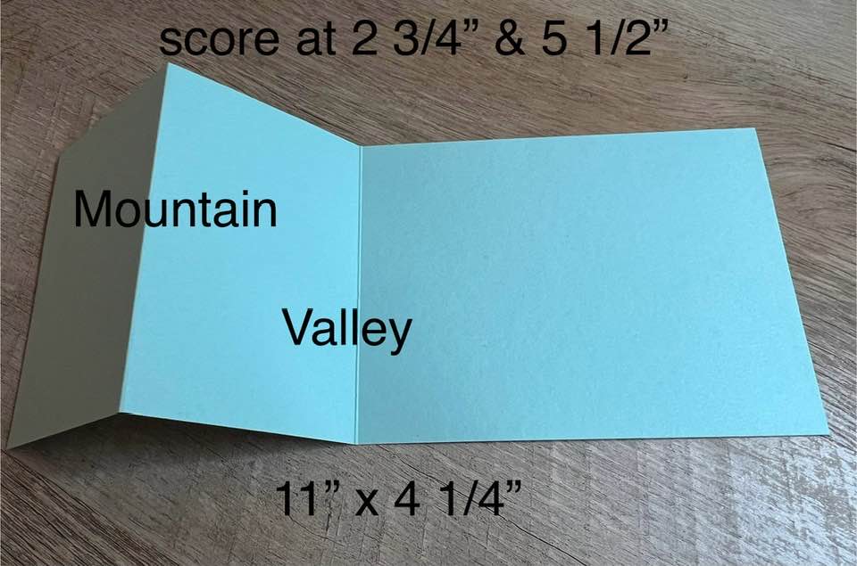 Score your 4 1/4″ x 11″ cardstock at 2 3/4″ and 5 1/2″. The 2 3/4″ fold should be a mountain orientation and the 5 1/2″ fold should be a valley fold. See picture for illustration: