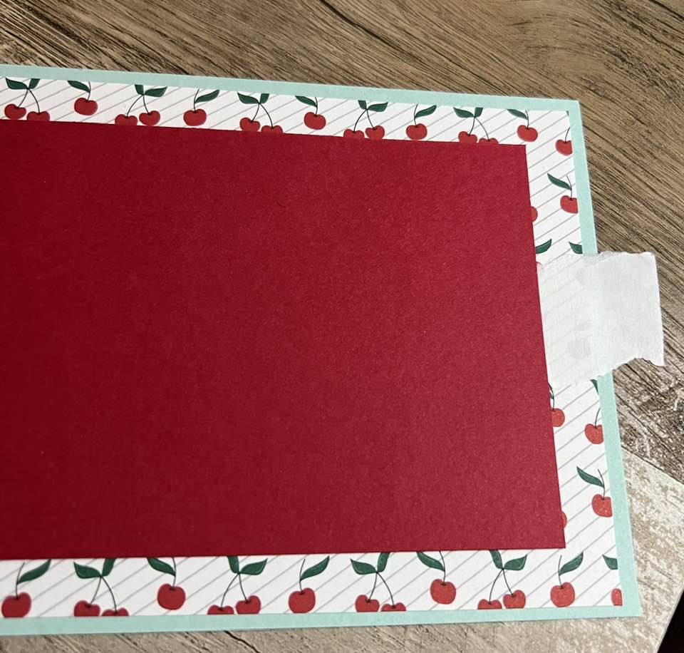 Take one piece of your cardstock that measures 4 1/2″ 3″, center it on the front of your card, apply adhesive to only the left side of your cardstock (so you don’t glue your card shut), and attach the cardstock.